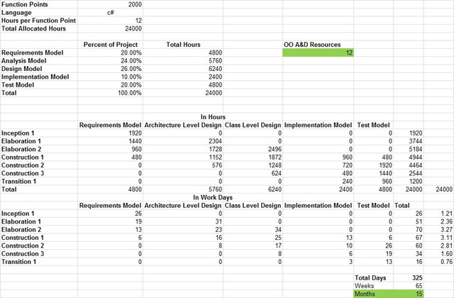 So lets assume team type 3 and a 2,000 function point system. The base calculation is Total Hours = 2,000 FP x 12 HRs/FP = 24,000 Hours = 12 Person Years Effort